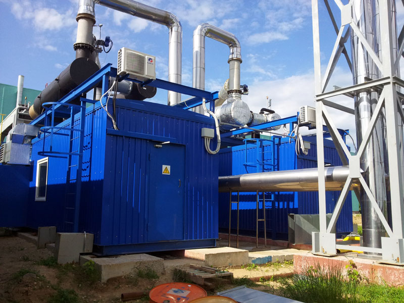 Газопоршневая теплоэлектростанция состоит из двух теплоэлектростанций контейнерного типа, работающих на одну тепловую и электрическую нагрузки. Мощность каждой теплоэлектростанции составляет 1,8 МВт (1,25 МВт – электрической энергии и 0,55 МВт – тепловой. Для нормального функционирования газопоршневого установки необходимо, чтобы температура воздуха в контейнере была в диапазоне +18…+26 ‘С. Функцию подачи и регулирования температуры воздуха в контейнере осуществляет система вентиляции контейнера.
