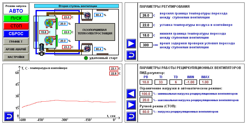 На панели оператора отображается мнемосхема системы вентиляции, график изменения температуры в контейнере за 10 минут, архив аварий. Задаются уставка температуры воздуха в контейнере, уставки верхней и нижней границ перехода между ступенями вентиляции, время задержки проверки условия перехода между ступенями вентиляции; параметры ПИД-регуляторов приточных и рециркуляционных вентиляторов, а также насоса подогрева; настройки режима проветривания.