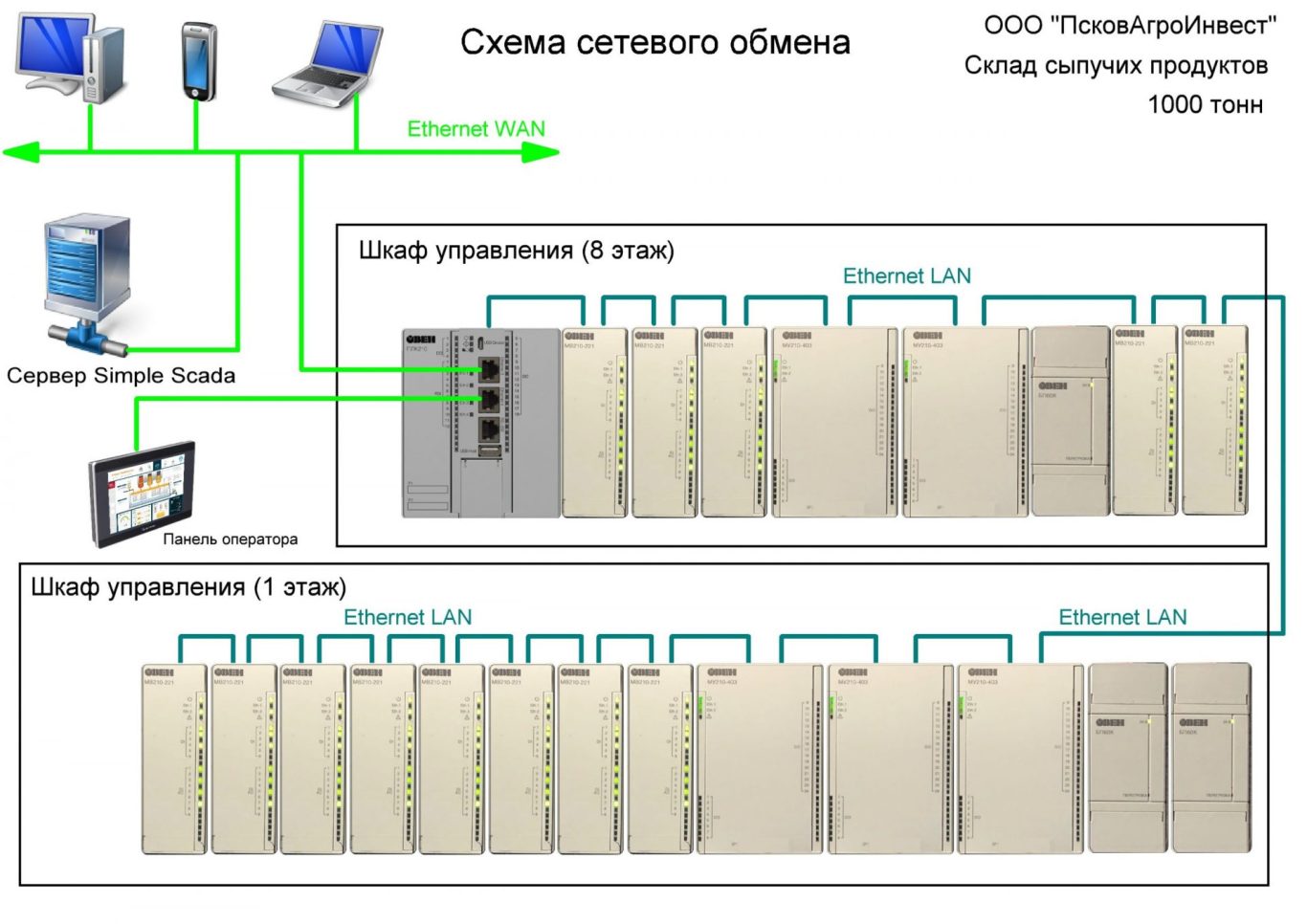 Склад сыпучих продуктов (1000 тонн) в Пскове используется для приема, хранения, отгрузки различных зерновых культур и гранулированного комбикорма. Автоматическая система управления создана на базе контроллера ОВЕН ПЛК210 и расширителей ОВЕН Мх210.