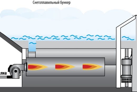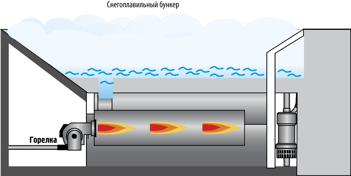 Технология плавления снега основана на использовании тепла, получаемого при работе дизельной горелки, установленной на специальный водогрейный котел. Он совмещен по газовому тракту с кожухотрубным теплообменником. Вся эта система располагается в снегоплавильном бункере и погружена в теплоноситель – талую воду. При работе горелки происходит разогрев стенок котла и теплообменника, тепло передается теплоносителю, который, в свою очередь, отдает его снежной массе, вбрасываемой определенными порциями внутрь бункера. Для интенсификации процесса плавления снега производится перемешивание теплоносителя и снежной массы с помощью погружного циркуляционного насоса. Объектами управления являются: горелки, циркуляционный насос, электроуправляемая задвижка для сброса избытка воды и средства аварийной сигнализации. При помощи датчиков температуры и давления контролируются технологические параметры системы: