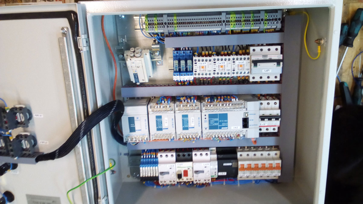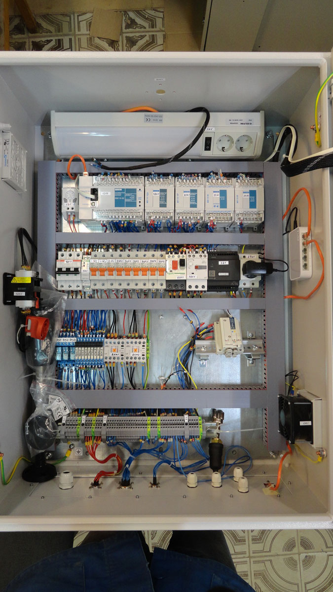 - Шкаф управления емкостью приготовления ШУ1, выполненный на программируемом логическом контроллере ПЛК110 компании ОВЕН (ПЛК110-24.30.Р-М — 18 дискретных входов, 12 дискретных выходов — э/м реле).