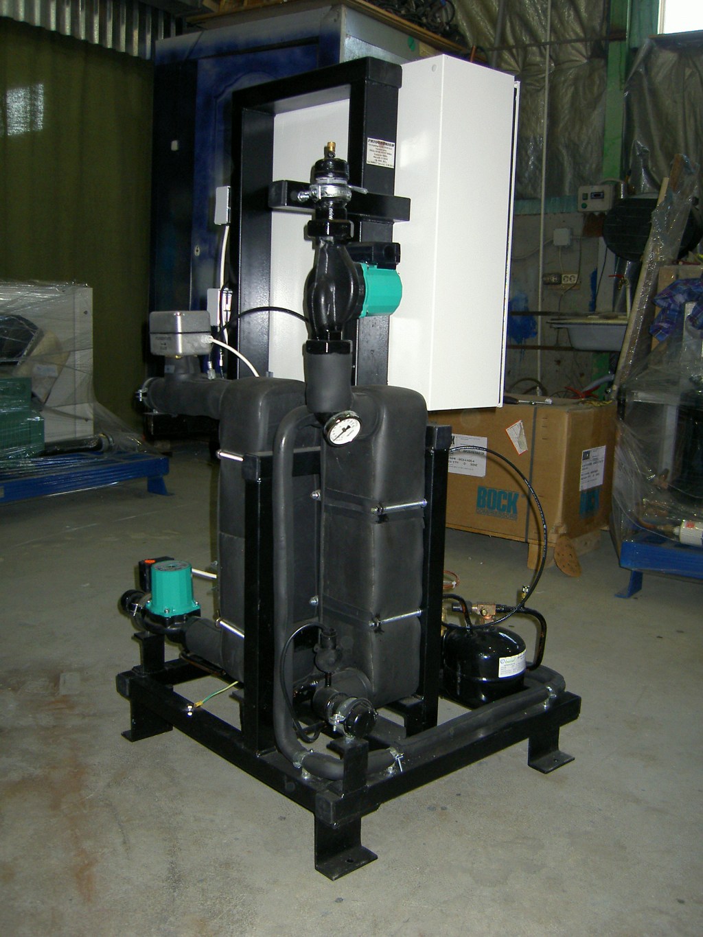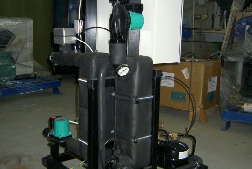 Тепловой насос обеспечивает теплом коттедж площадью 250м2 за счет использования тепла грунта и грунтовых вод с закрытыми коллекторами. Испаритель был выполнен из 18-ти вертикальных скважин, в которых по трубам циркулирует однофазный хладоноситель. Коэффициент тепла в этом тепловом насосе составил 3.9 при теплопроизводительности в 20кВт. Энергопотребление теплового насоса составляет 5.1кВт. Данный коттедж был построен заказчиком с максимальным исползованием современных западных теплосберегающих технологий. Поэтому этой небольшой теплопроизводительности вполне хватает на его обогрев.