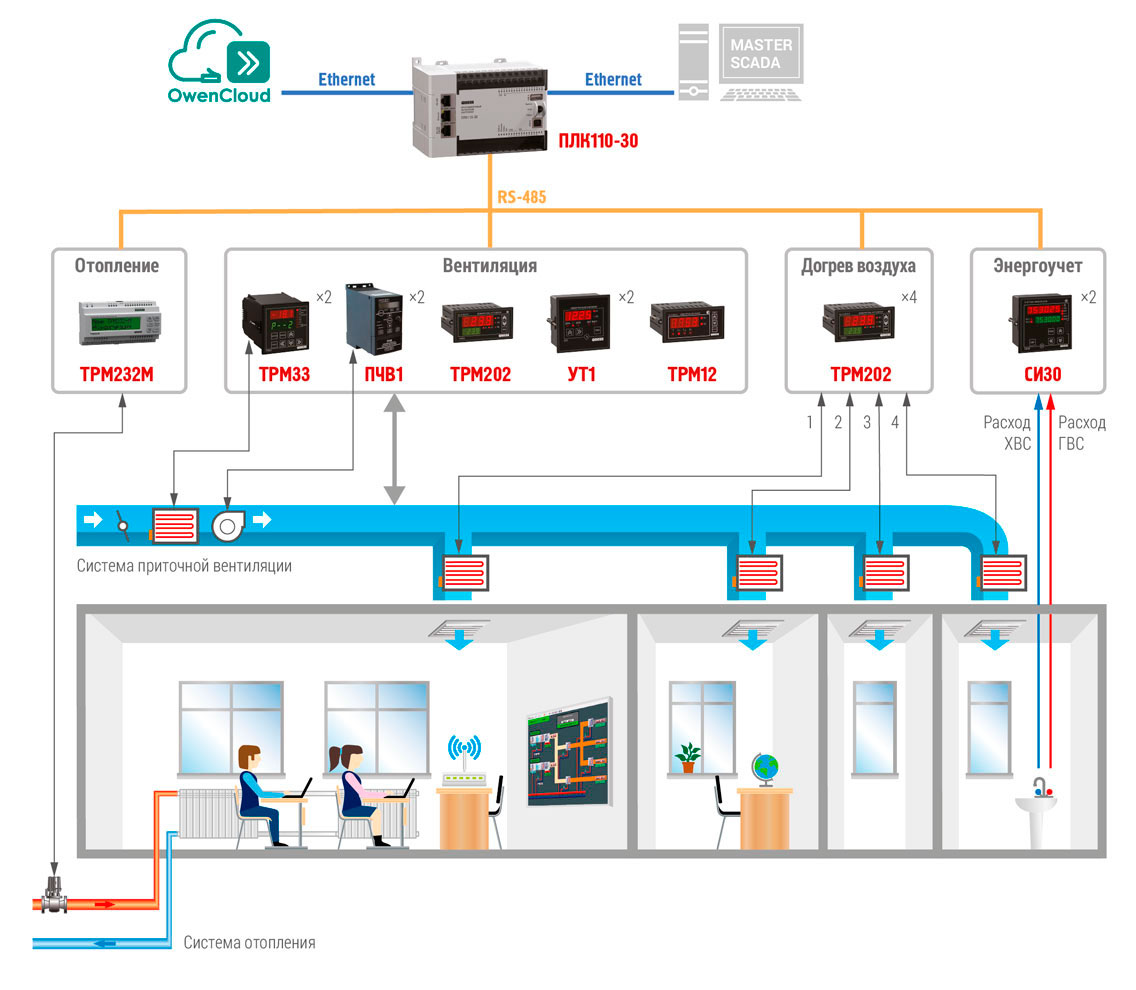 В системе управления отоплением и вентиляцией примняется оборудование ОВЕН: