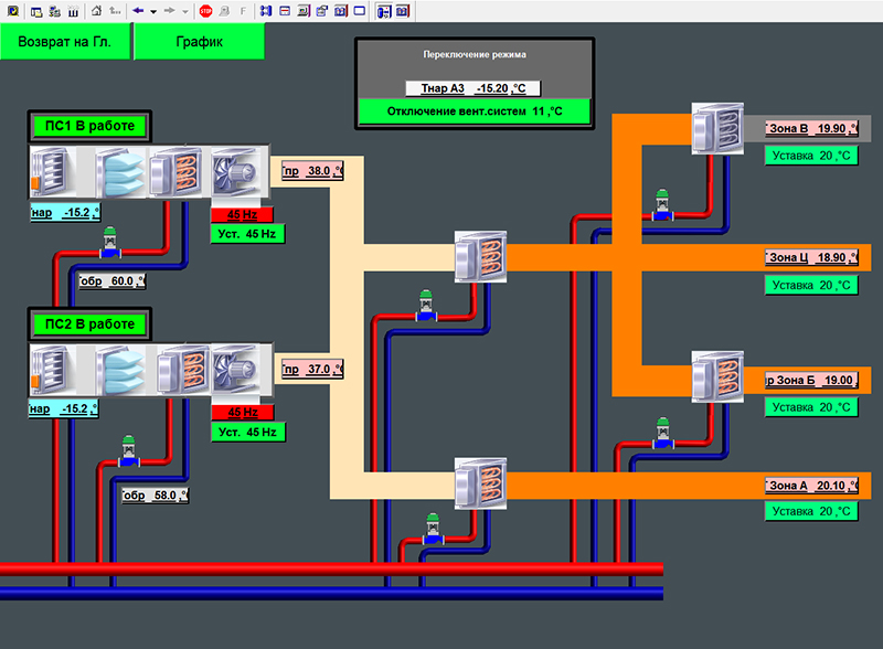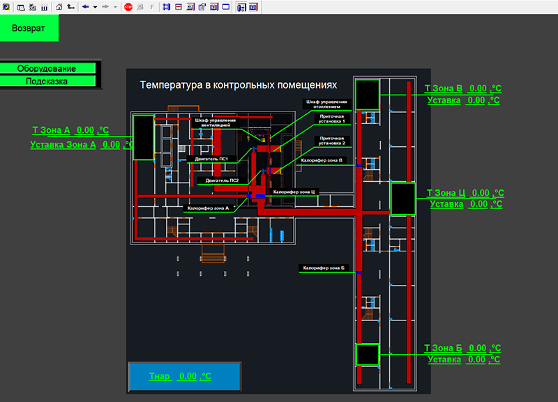 Для изучения работы оборудования в SCADA-системе создано несколько экранов. На плане нанесено оборудование приточных систем и отопления. В контрольных помещениях отображается температура, мнемосимволы меняют цвет в зависимости от текущей температуры (рис. 2).