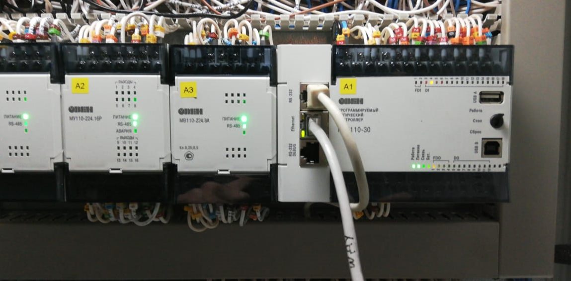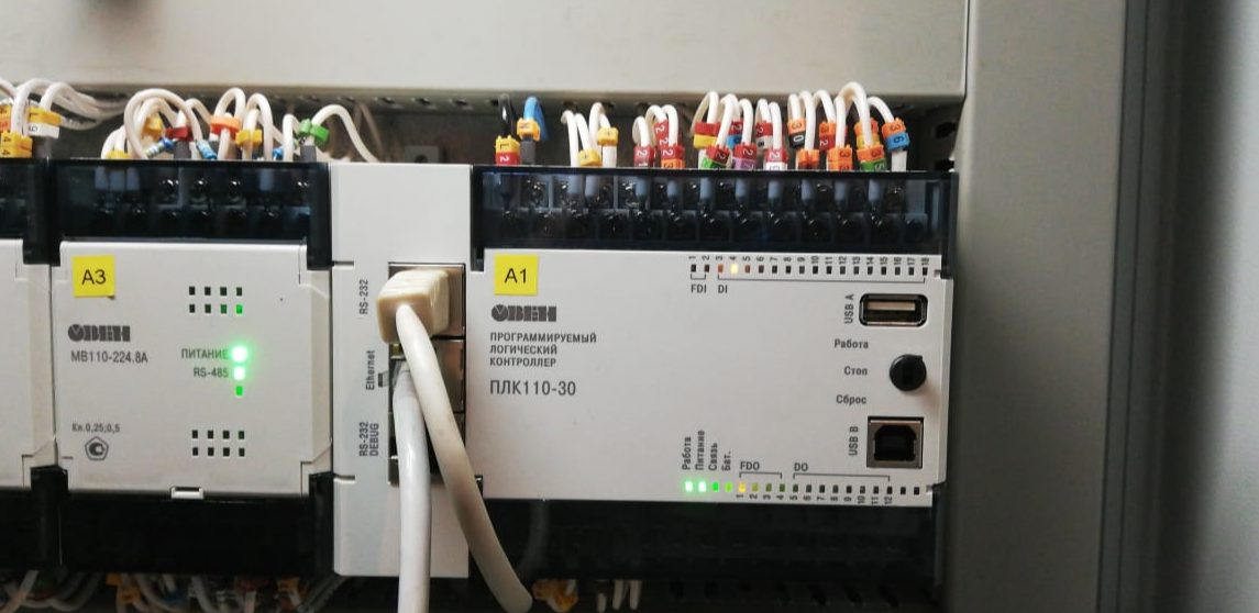 Для управления разработан шкаф управления, в основе которого программируемый логический контроллер ОВЕН ПЛК110-30 и модули ввода/вывода линейки ОВЕН Мх110 (МВ110-8 8А, МУ110-16Р).