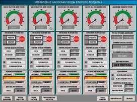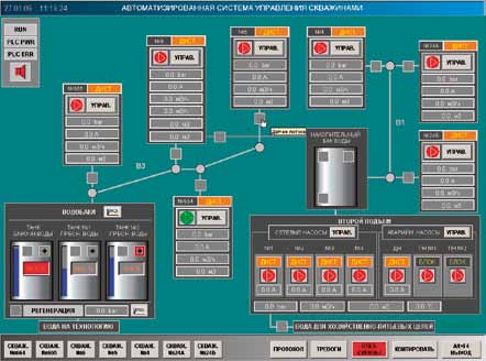 На экранах управления скважинами отображаются: температура воздуха внутри здания, затопление, пожар, взлом. Диспетчер имеет возможность включить дистанционный режим управления и контролировать работу скважин и станции водозабора: включать и выключать насосы и производить перезапуск устройства плавного пуска. В программе визуализации можно просмотреть графики изменения давления воды, тока двигателя, мгновенного расхода воды, уровни наполнения ёмкостей.