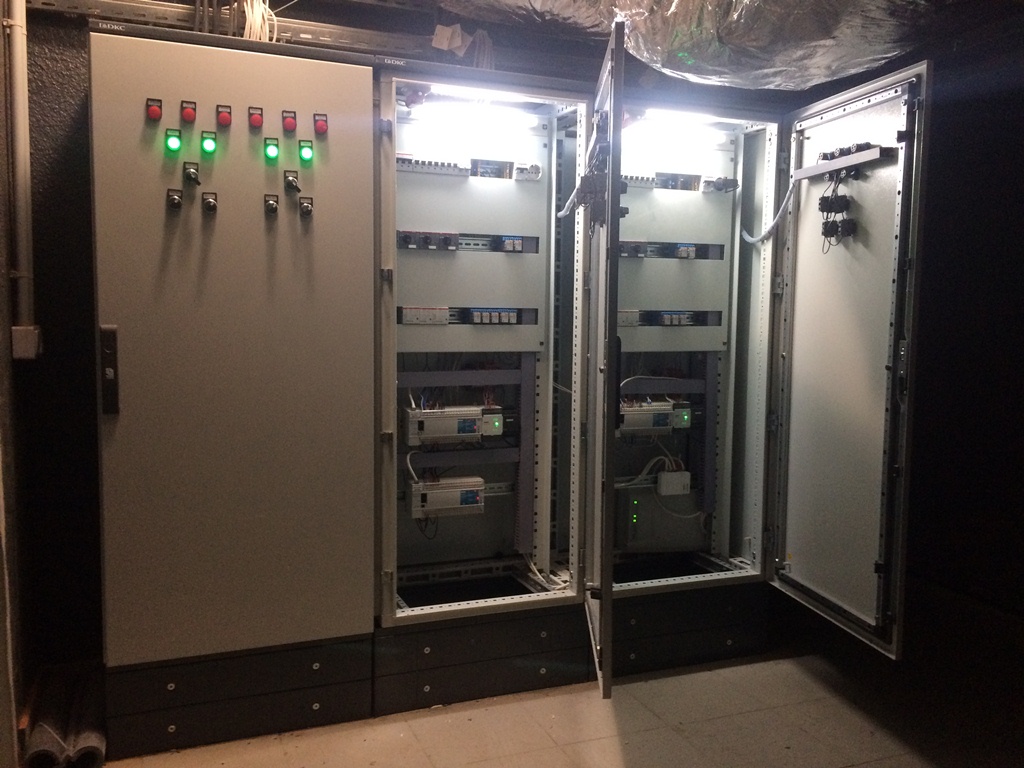 В основе системы управления – программируемый логический контроллер ОВЕН ПЛК160 и модули ввода/вывода: ОВЕН МВ110-8А и ОВЕН МК110-8ДН.4Р. Контроллеры для управления оборудованием расположены в шкафах, устанавливаемых рядом с щитами управления. Так как используется оборудование с распределенной архитектурой, то в некоторых щитах стоят только необходимые модули ввода-вывода, связанные с основным контроллером по интерфейсной шине RS-485 (Modbus). Система имеет возможность наращивания, поэтому на следующих этапах новые контроллеры врезаются в общую сеть. При этом каждый контроллер имеет свой уникальный номер. Сетевые процессоры содержат средства организации обмена информацией между собой, диспетчерскими АРМами и контроллерами. Происходит объединение в единую контроллерную сеть.