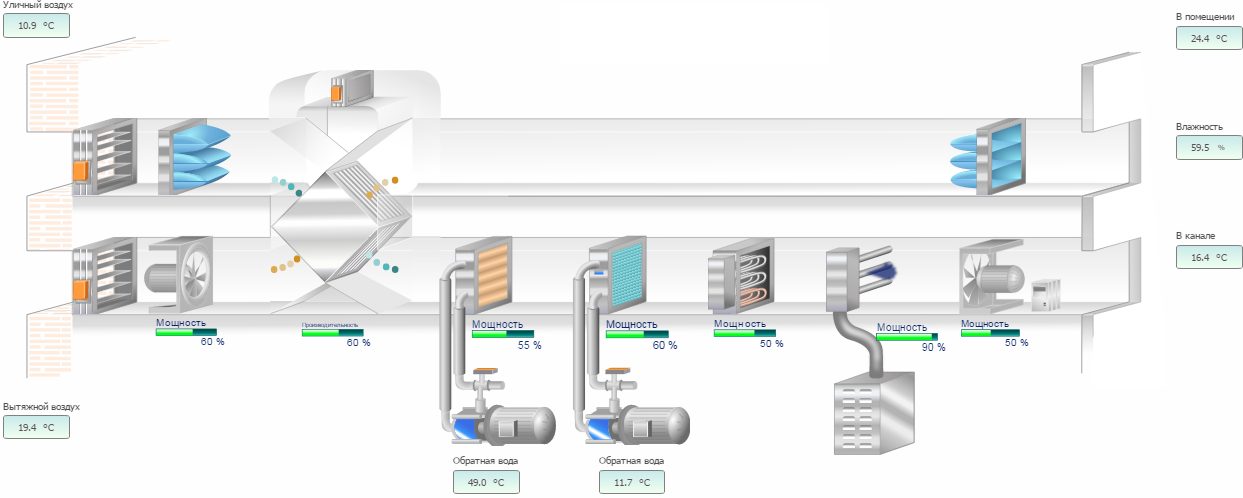 На сервере функционирует специализированное программное обеспечение OPC-сервер и SCADA. Система позволяет получать информацию о работе инженерных систем здания. Система управления обеспечивает работу установок приточной и вытяжной вентиляции в режиме автоматического управления, включает и выключает все установки и управляет их работой в «зимнем» и «летнем» режимах.