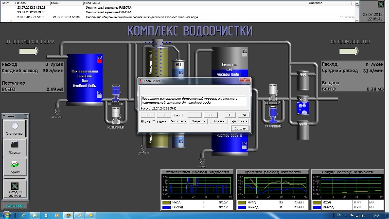 В случае возникновения аварийной ситуации (переполнения любой из технологических емкостей, аварийного отключения насосов ит.д.) должна включаться аварийная звуковая и световая сигнализация.