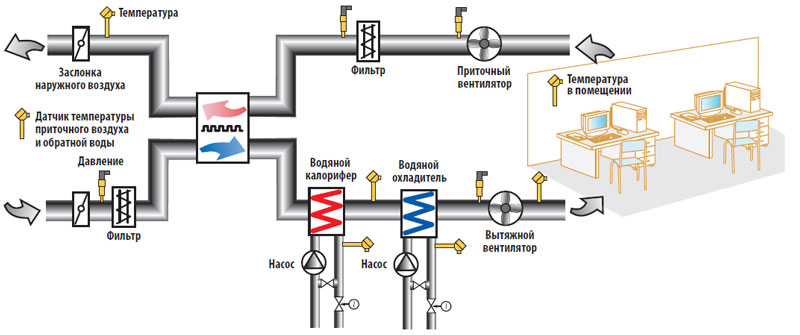 Однако такие системы, как правило, применяется редко и только в небольших помещениях, где уже есть кондиционеры. Чаще для зданий и сооружений создается система вентиляции с водяными калорифером и охладителем (рис. 1).