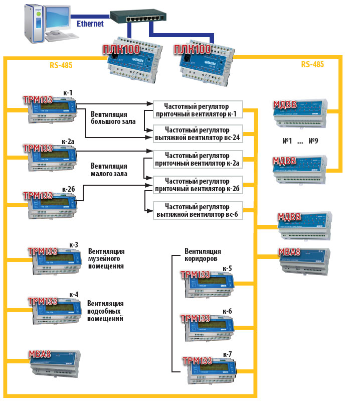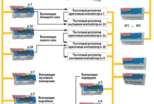 Большое количество вытяжных систем (36) не позволило реализовать сблокированную с приточными установками схему управления и диспетчеризации вытяжных систем. Поэтому за основу были взяты контроллеры ОВЕН ПЛК100 с блоками расширения МДВВ и МВА8, обеспечивающие полноценный контроль за исправностью систем вытяжной вентиляции и их управлением, а также контроль температуры тепло- и холодоносителя в критических точках. Сами же контроллеры ПЛК100 управляют насосной станцией пожаротушения и параллельно служат концентраторами для сбора информации для ПЭВМ с системой SCADA, с которой и осуществляется управление всеми узлами вентиляции.