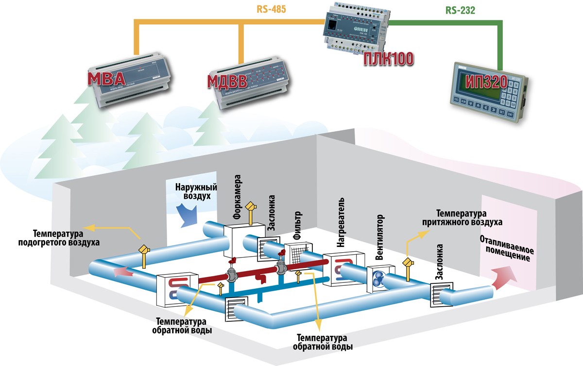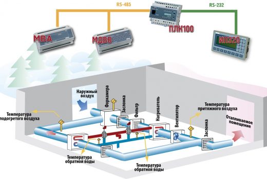 Команда разработчиков изучила различные подходы к решению подобной нетривиальной задачи, в том числе были рассмотрены стандартные «пакеты» на базе контроллеров ОВЕН ТРМ33, ТРМ133, ТРМ133М. Однако после проведенного анализа было установлено, что большинство представленных на рынке «пакетных» систем автоматики ориентированы на управление стандартным комплектом оборудования: приточная установка, калорифер, вентилятор, КЗР, вытяжная установка. Наличие дополнительных элементов оборудования в приточных установках, связанного с резервированием и дублированием основных функций, делало не приемлемым их использование. Стало ясно, что такой подход не пригоден. Поэтому специалисты в сжатые сроки разработали новые принципиальные и электрические схемы на основе программируемого логического контроллера ОВЕН ПЛК100 и сформировали основные требования к алгоритмам для приточных установок в различных зданиях ГТЭС. После сборки и тестирования оборудование было доставлено и установлено на объекте.