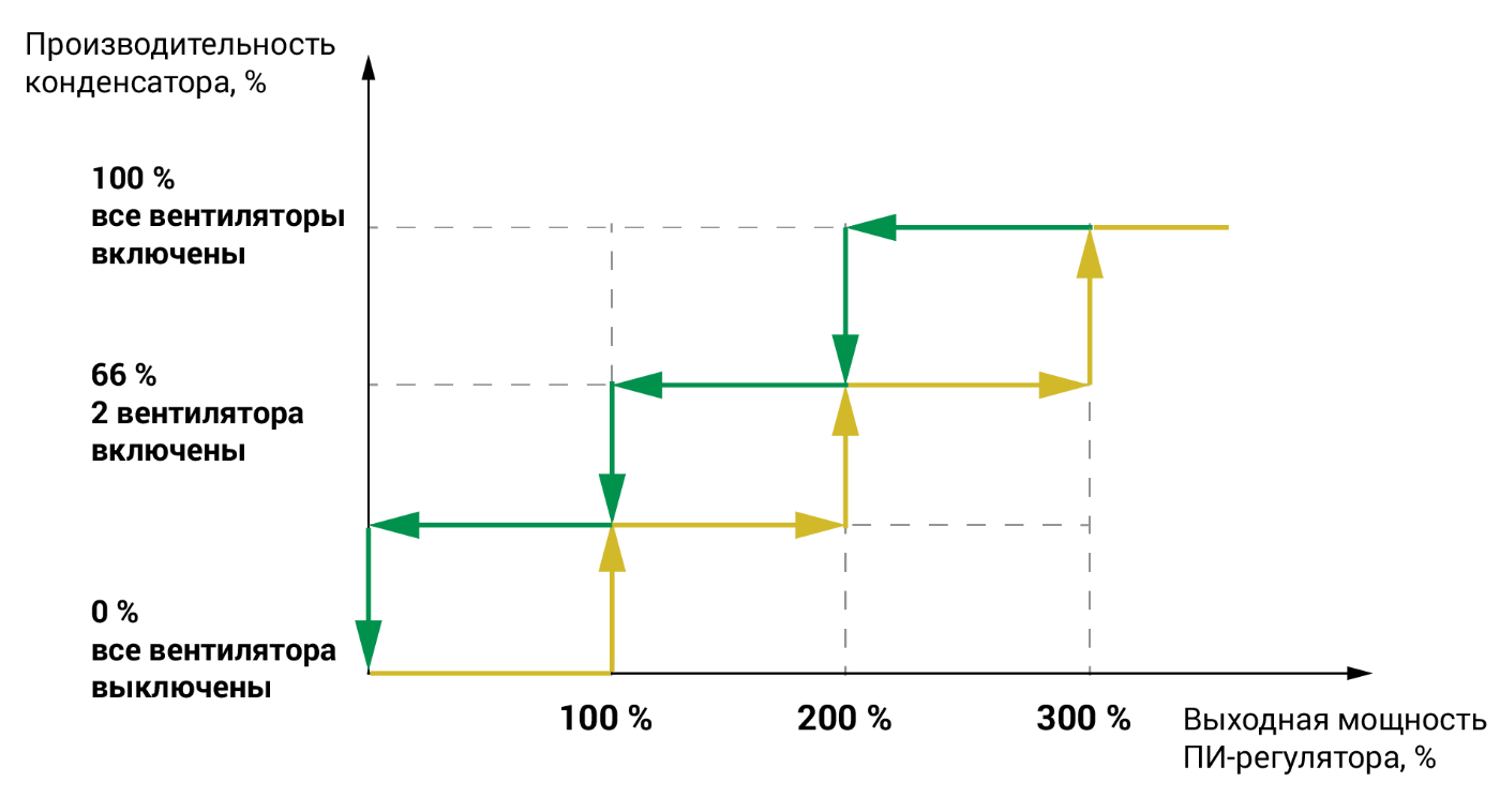 - Ступенчатое управление производительностью конденсатора ведется с помощью ПИ-регулятора.