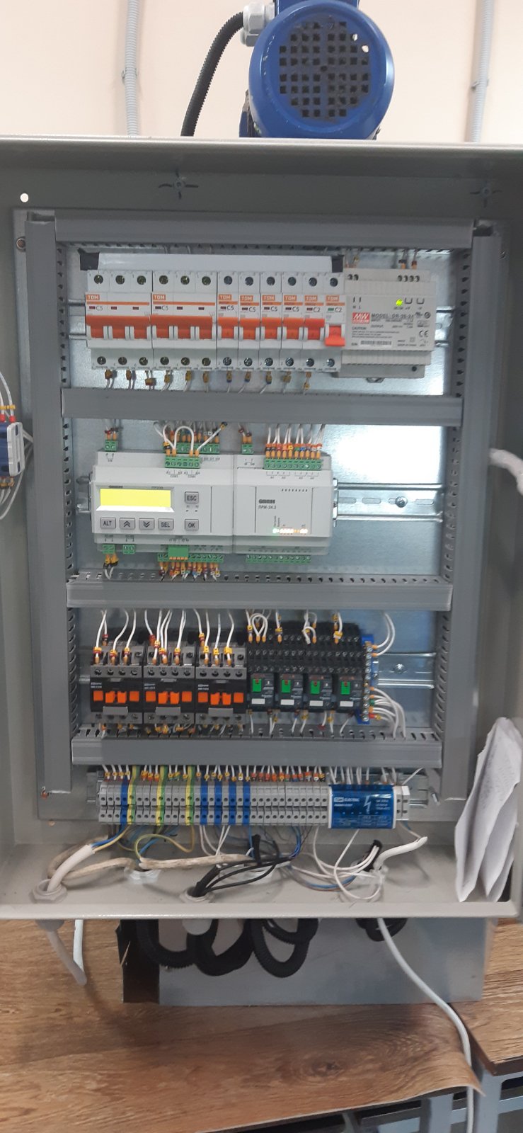 Для управления установкой разработан шкаф управления. В основе шкафа – программируемое реле ОВЕН ПР200 с модулем расширения ОВЕН ПРМ и сенсорная панель оператора СП307.