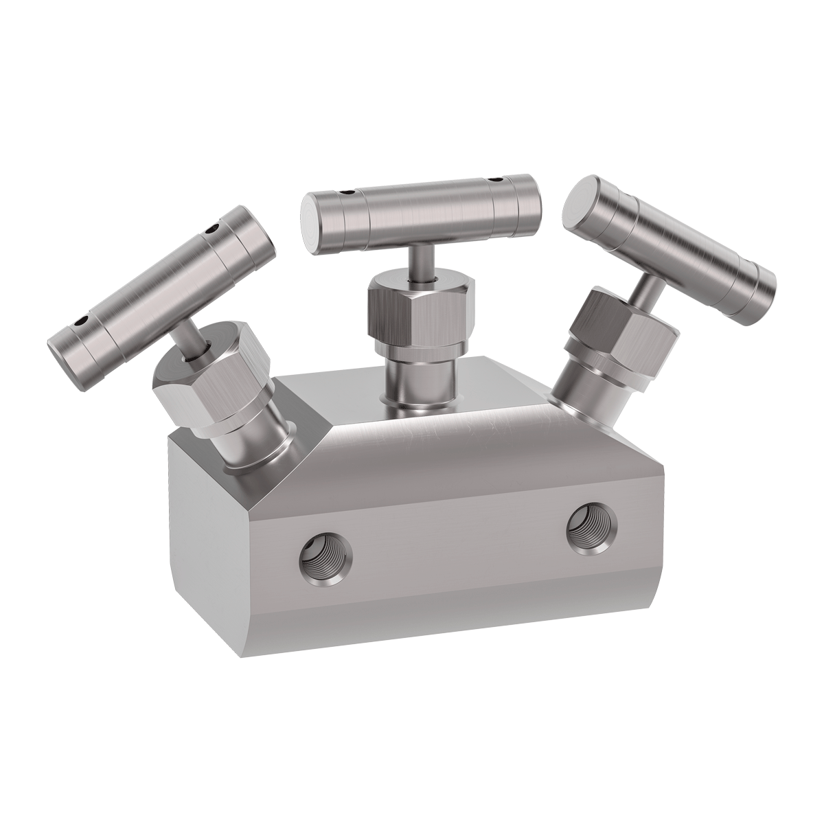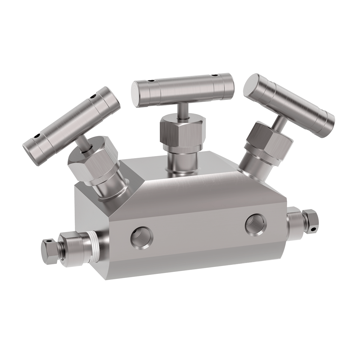 Трехвентильный блок экономичной серии для подключения датчиков перепада давления в составе узлов учета газа, присоединительная резьба со стороны процесса и со стороны датчика Rc1/8. Имеются два дренажных канала, перекрытых игольчатыми болтами. Давление рабочей среды до 40МПа.