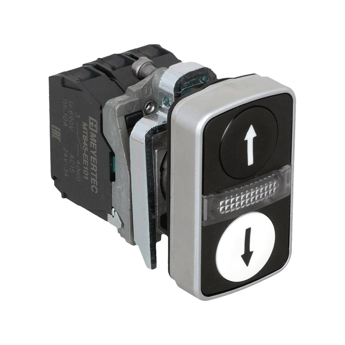 Кнопка двойная плоская с подсветкой, черная/белая, маркировка «стрелки вверх-вниз», 2NO, 24V AC/DC, IP65, металл