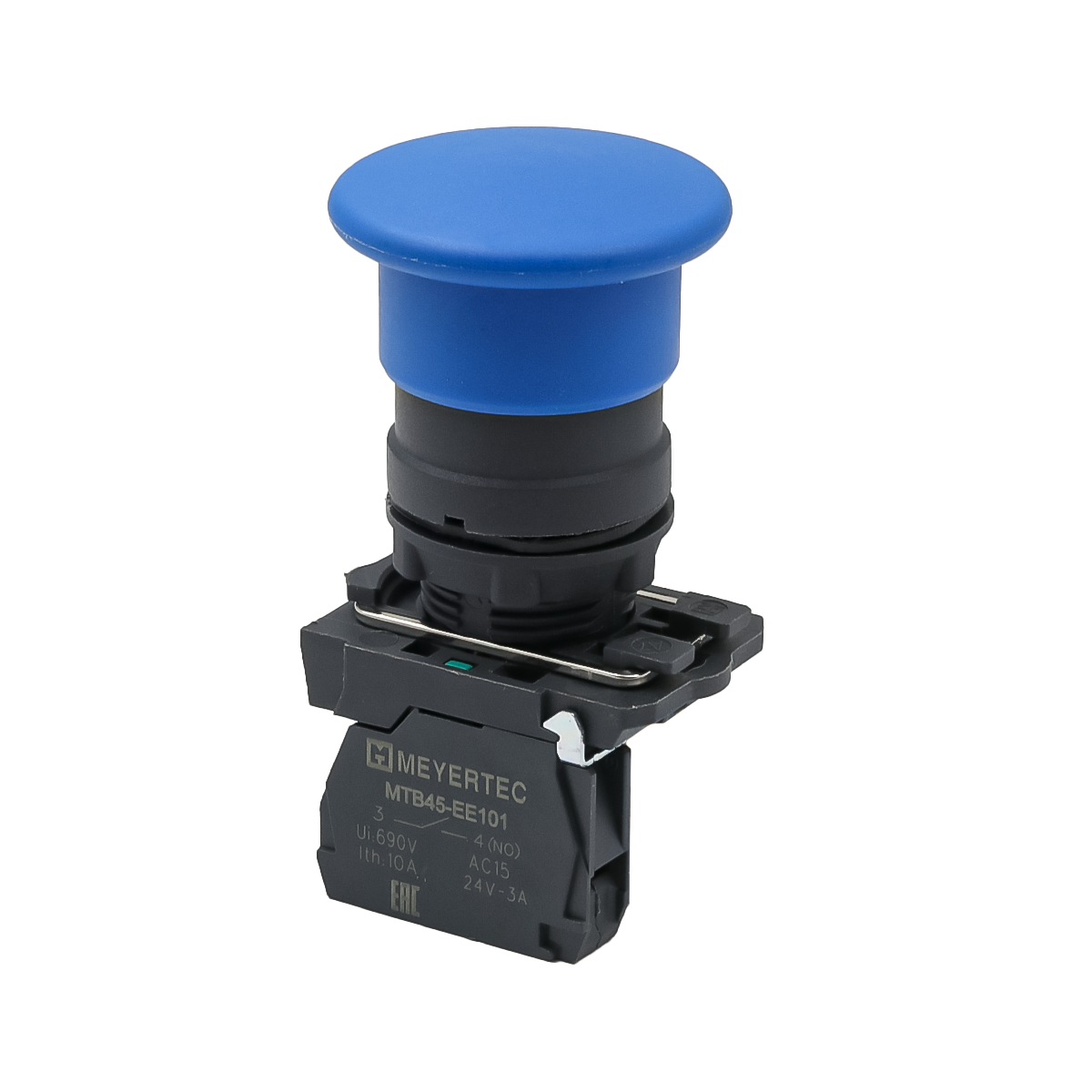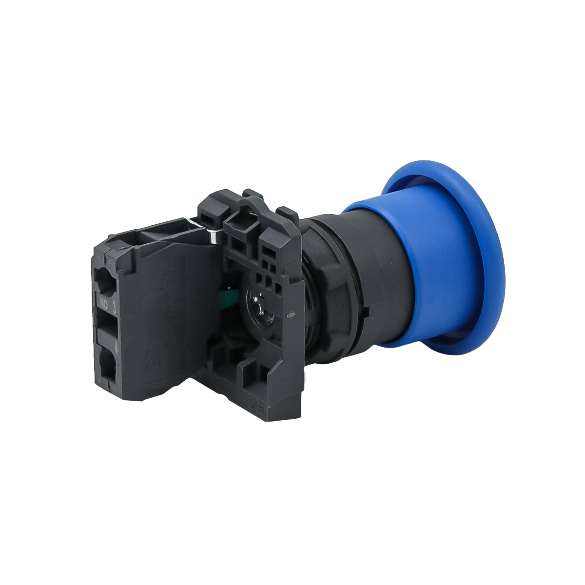 Кнопка грибовидная синяя, 40 мм, пружиный возврат, 1NO, IP65, пластик