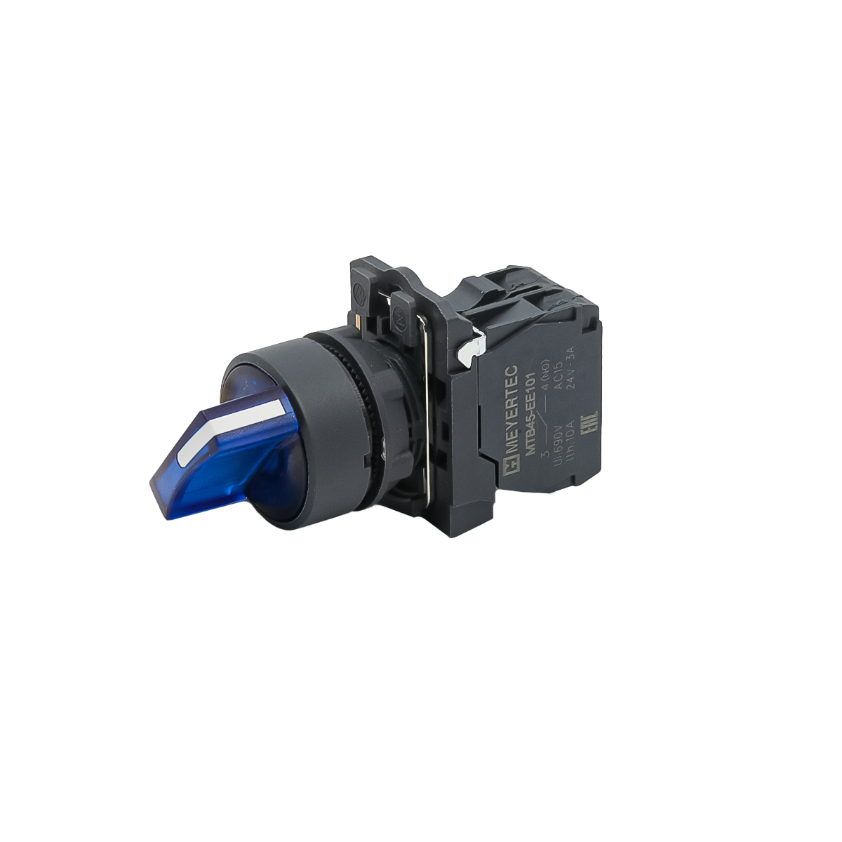 Переключатель на 3 положения с фиксацией и подсветкой, синий, 1NO, 24V AC/DC, IP65, пластик