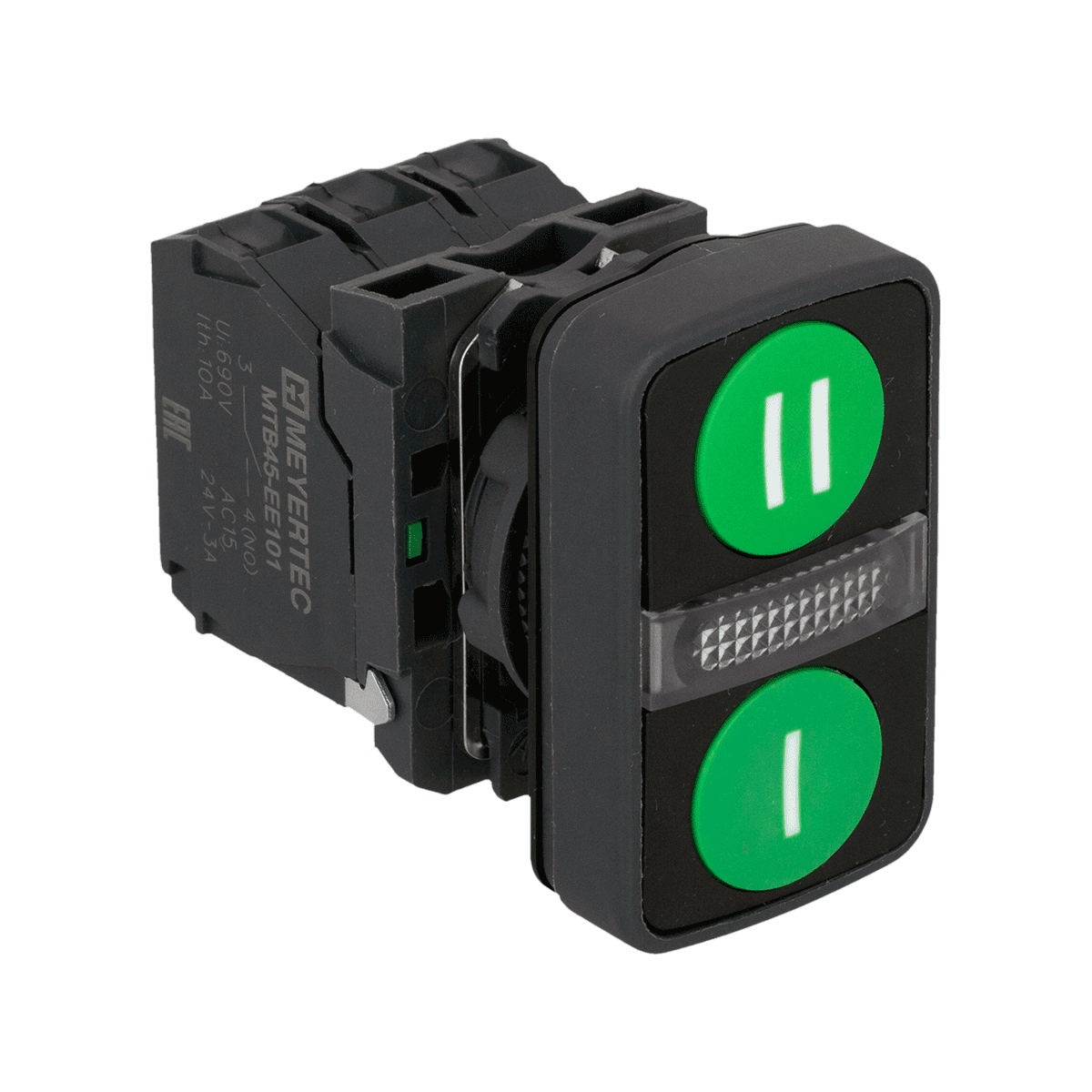 Кнопка двойная плоская с подсветкой, зеленая, маркировка «I+II», 2NO, 24V AC/DC, IP65, пластик
