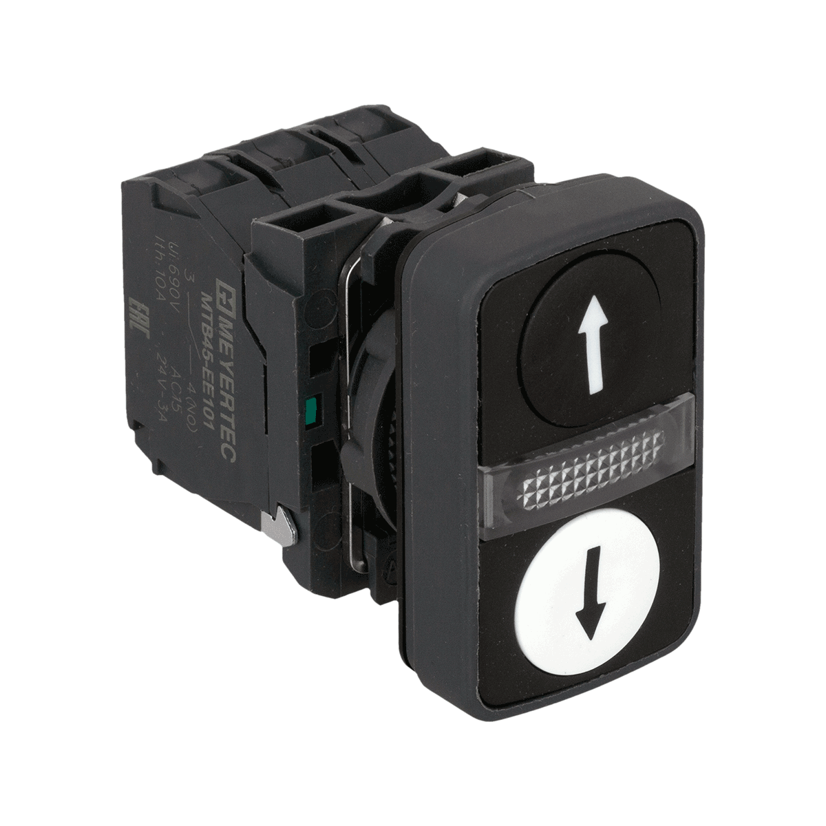 Кнопка двойная плоская с подсветкой, черная/белая, маркировка «стрелки вверх-вниз», 2NO, 24V AC/DC, IP65, пластик