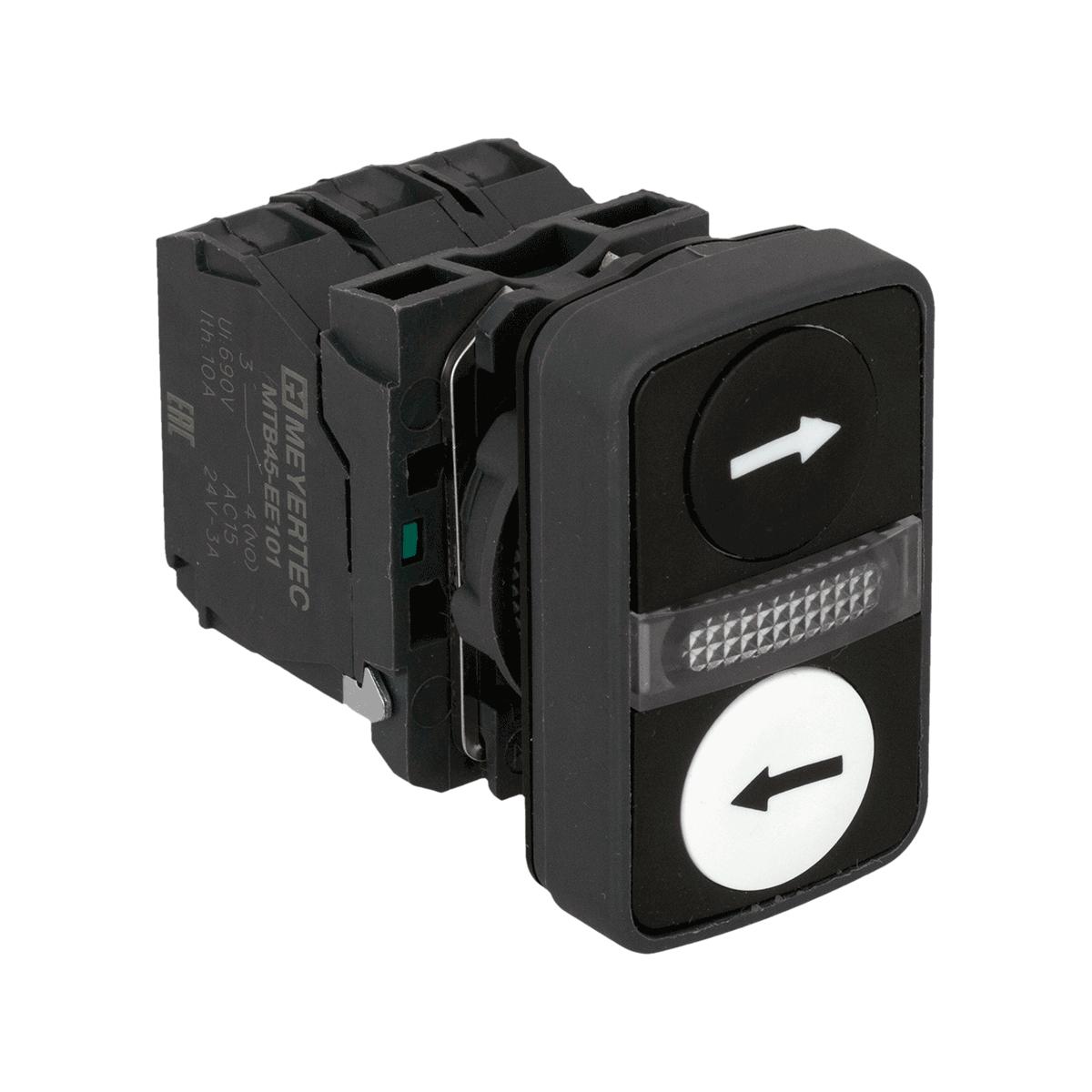 Кнопка двойная плоская с подсветкой, черная/белая, маркировка «стрелки влево-вправо», 2NO, 24V AC/DC, IP65, пластик