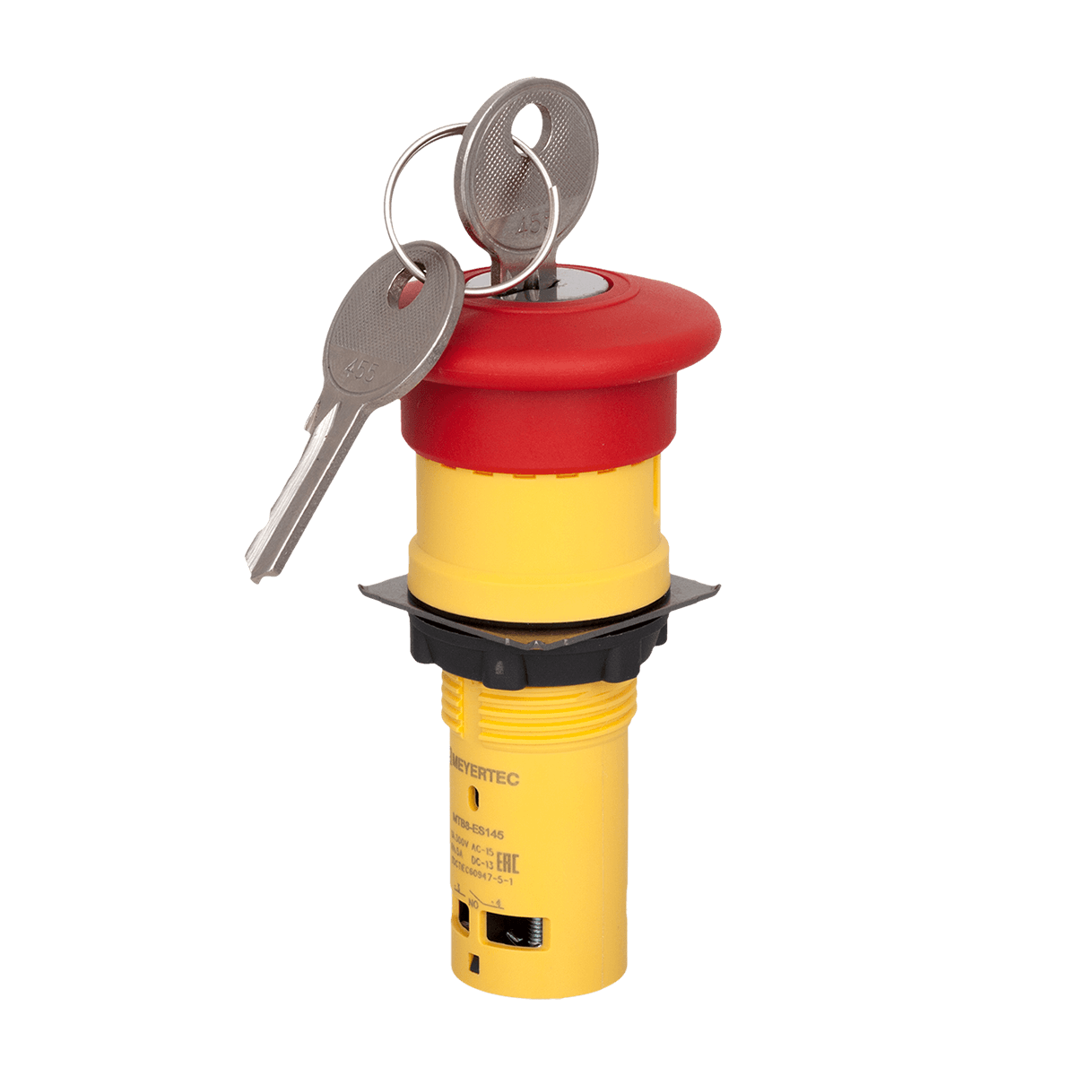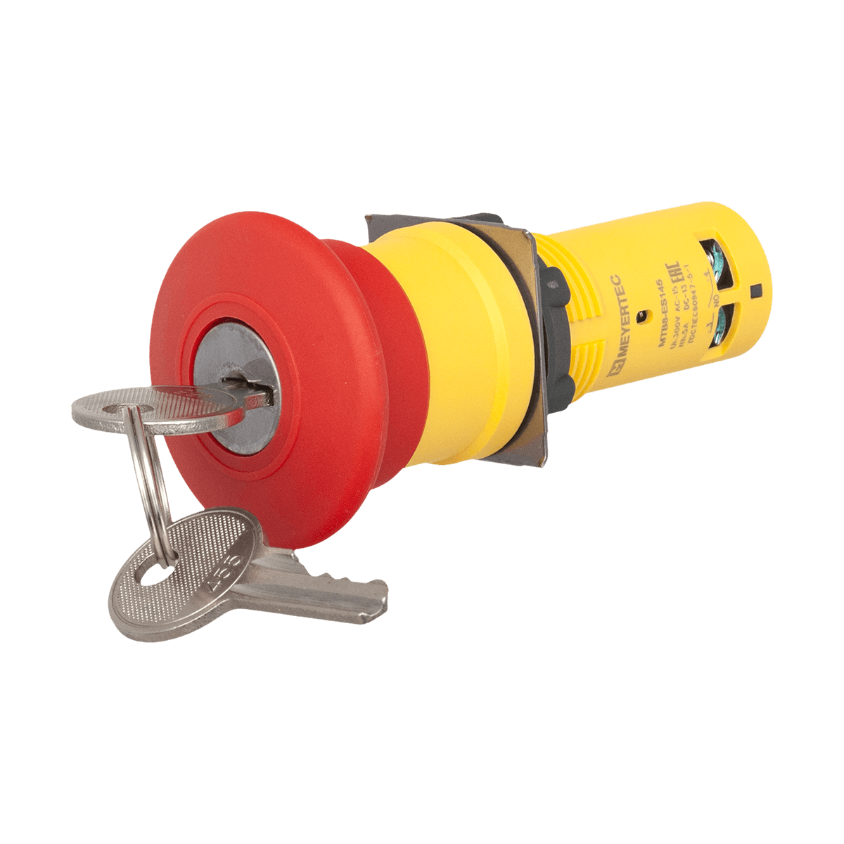 Кнопка грибовидная красная с ключом, c фиксацией, 1 выемка Ø 40 мм, 1NO+1NC, IP65, пластик