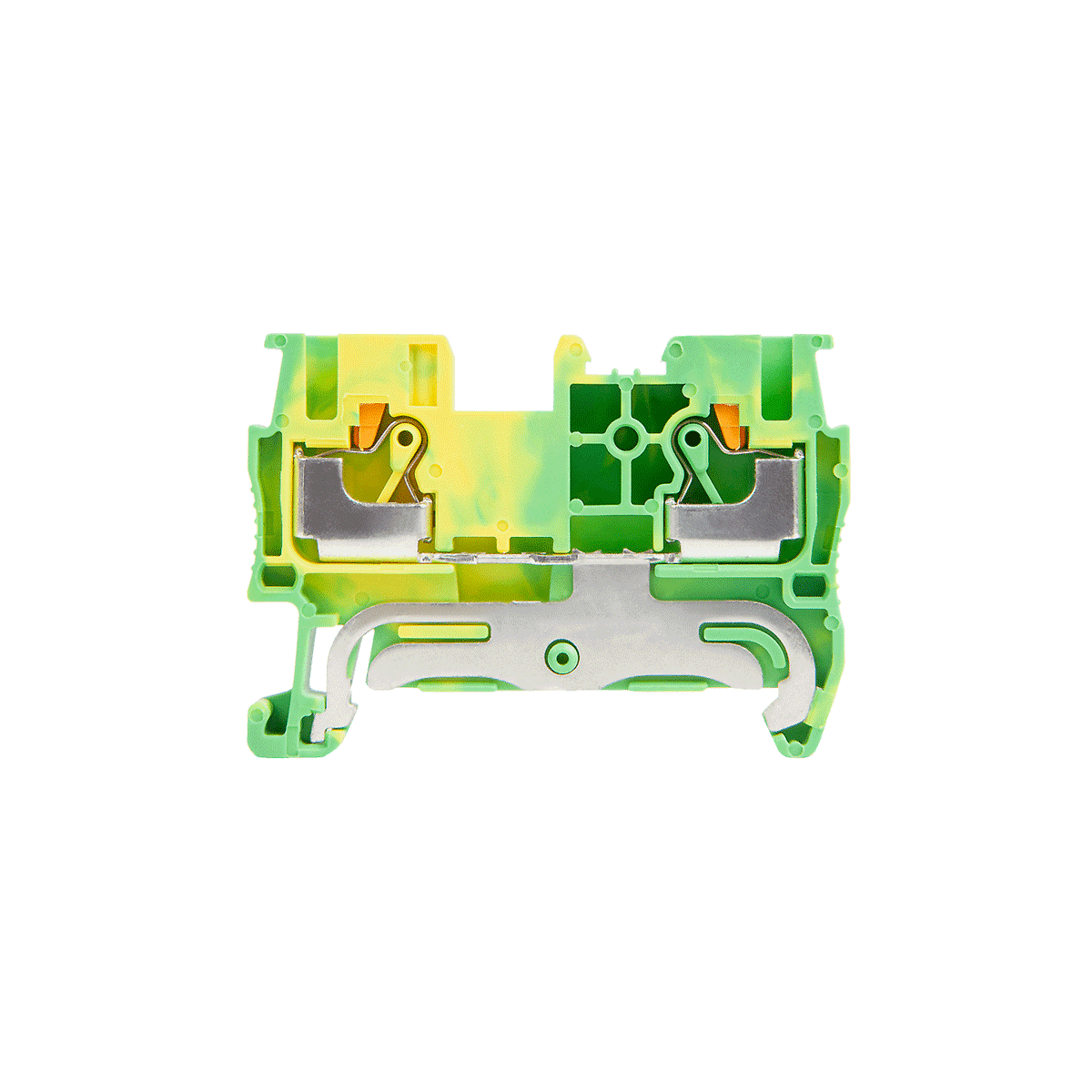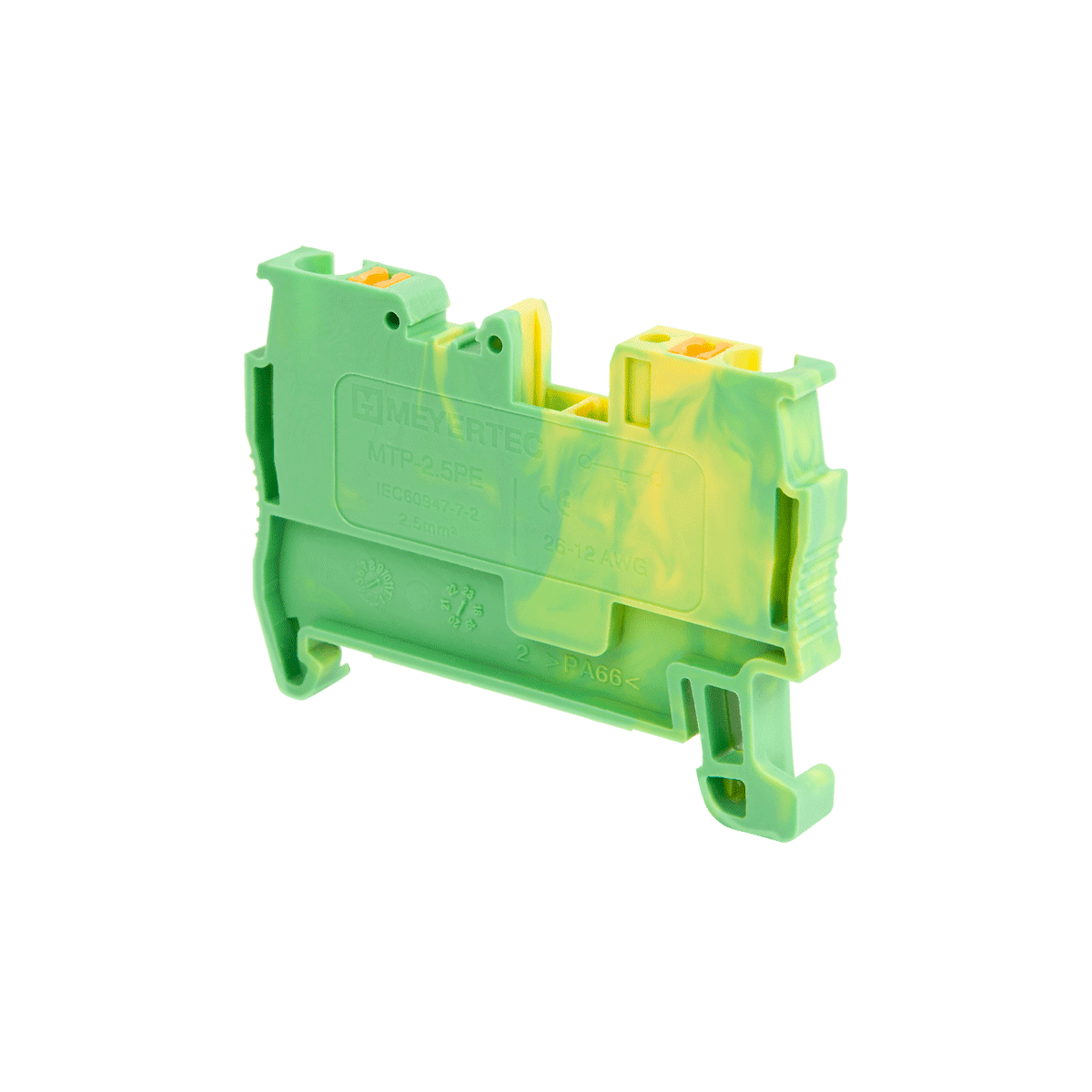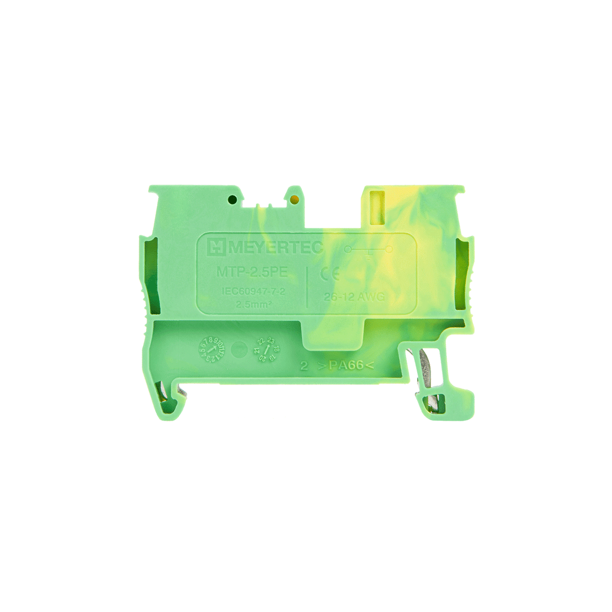 Клеммы push-in «Земля» MTP-2.5PE применяются для подключения защитных заземляющих проводников. Клемма фиксируется на DIN-рейке простым защелкиванием без использования инструментов.