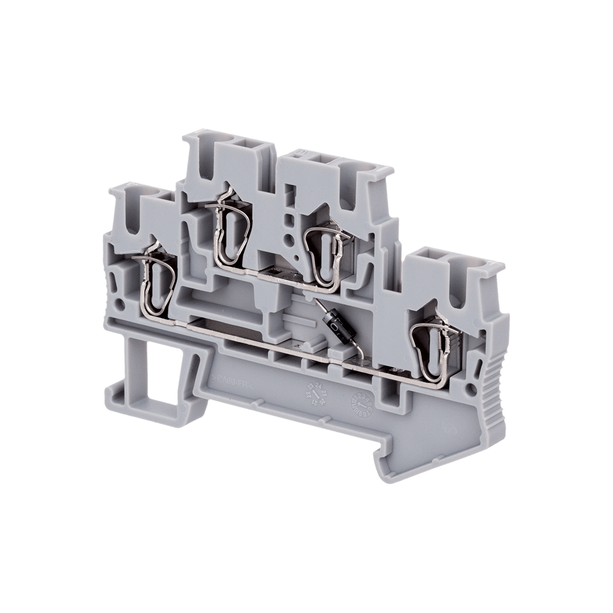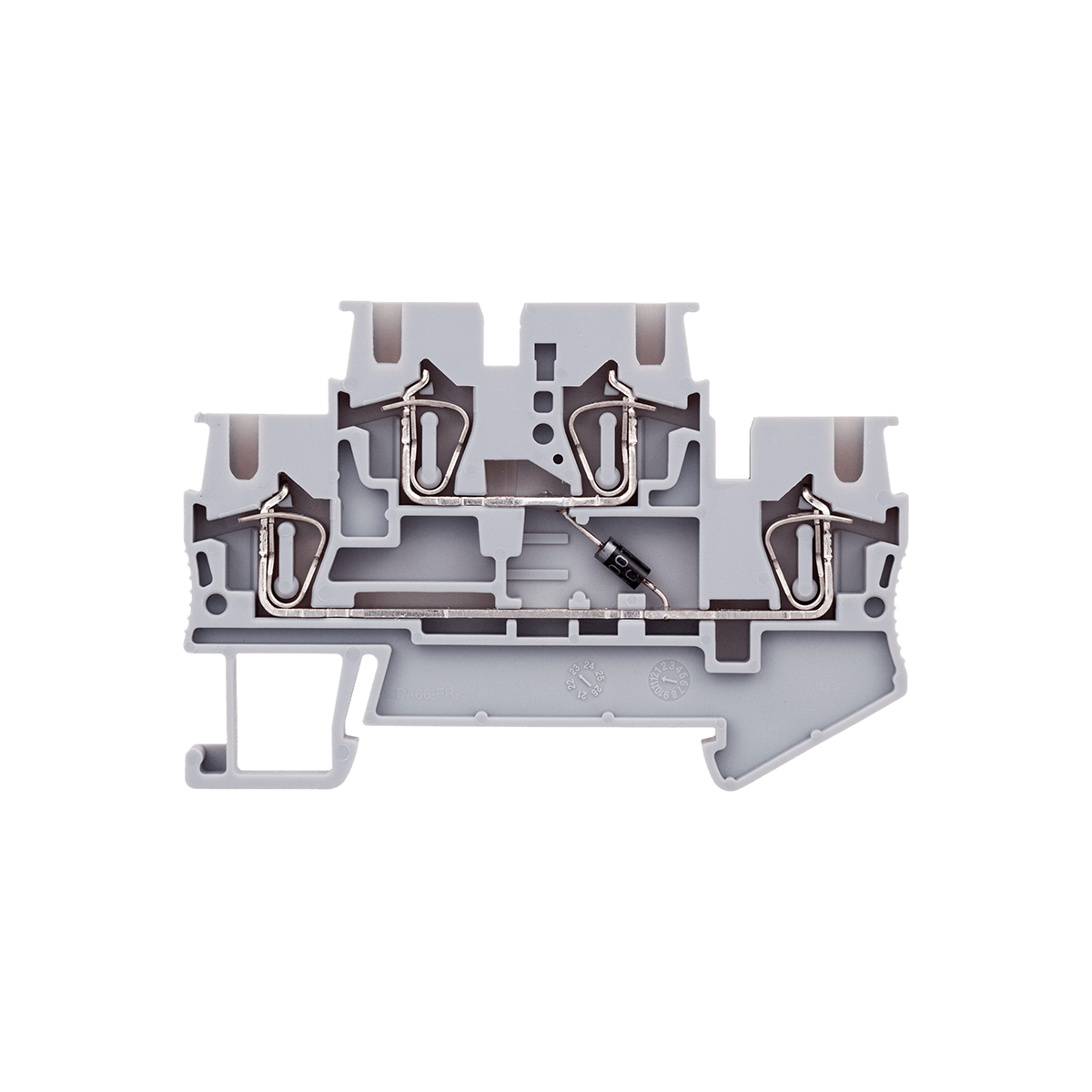 Двухуровневые пружинные клеммы с диодом MTS-D2.5DV применяются в шкафах автоматики для защиты участка цепи от токов обратной полярности, вызванных работой коммутационных устройств. Указанная на корпусе клеммы полярность соответствует полярности диода. Анод (плюс), катод (минус).