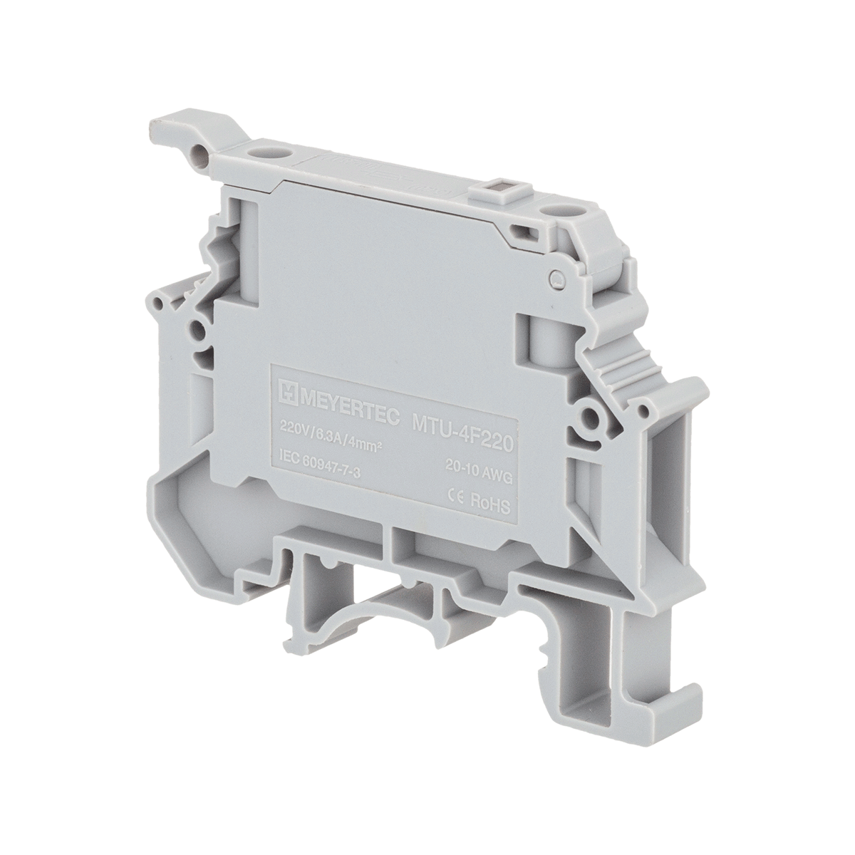 Клеммы MTU-4F220 c держателем предохранителя применяются для защиты цепей управления и сигнализации от перегрузки и коротких замыканий. Модификации со светодиодной индикацией информируют о перегорании предохранителя.