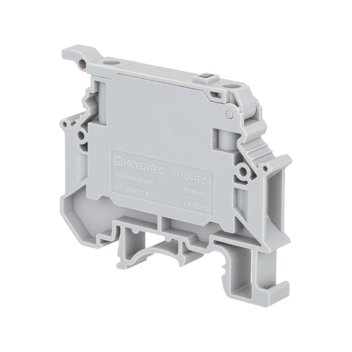 Клеммы MTU-4F24 c держателем предохранителя применяются для защиты цепей управления и сигнализации от перегрузки и коротких замыканий. Модификации со светодиодной индикацией информируют о перегорании предохранителя.