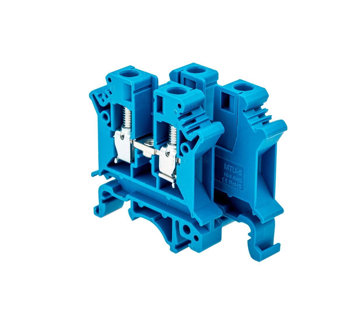 Одноуровневые винтовые клеммы MTU-6BL – простой и удобный способ подключения устройств в шкафах автоматики. Клеммы MTU-6BL предназначены для проводников сечением 6мм2. Открытую токопроводящую часть клеммного ряда необходимо закрыть торцевой заглушкой. Одноуровневые клеммы имеют одинаковые габаритные размеры для всех сечений, кроме ширины, которая зависит от сечения выбираемого проводника.