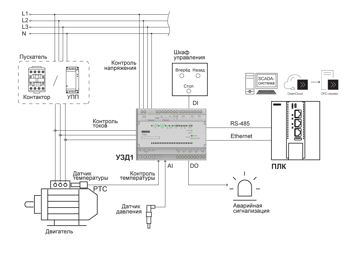 УЗД1 — это система защиты и управления двигателем, которая обеспечивает мгновенный мониторинг всех его параметров. Прибор позволяет производить пуск, реверс и останов электродвигателя путем управления внешними контакторами или другими устройствами для пуска двигателя.